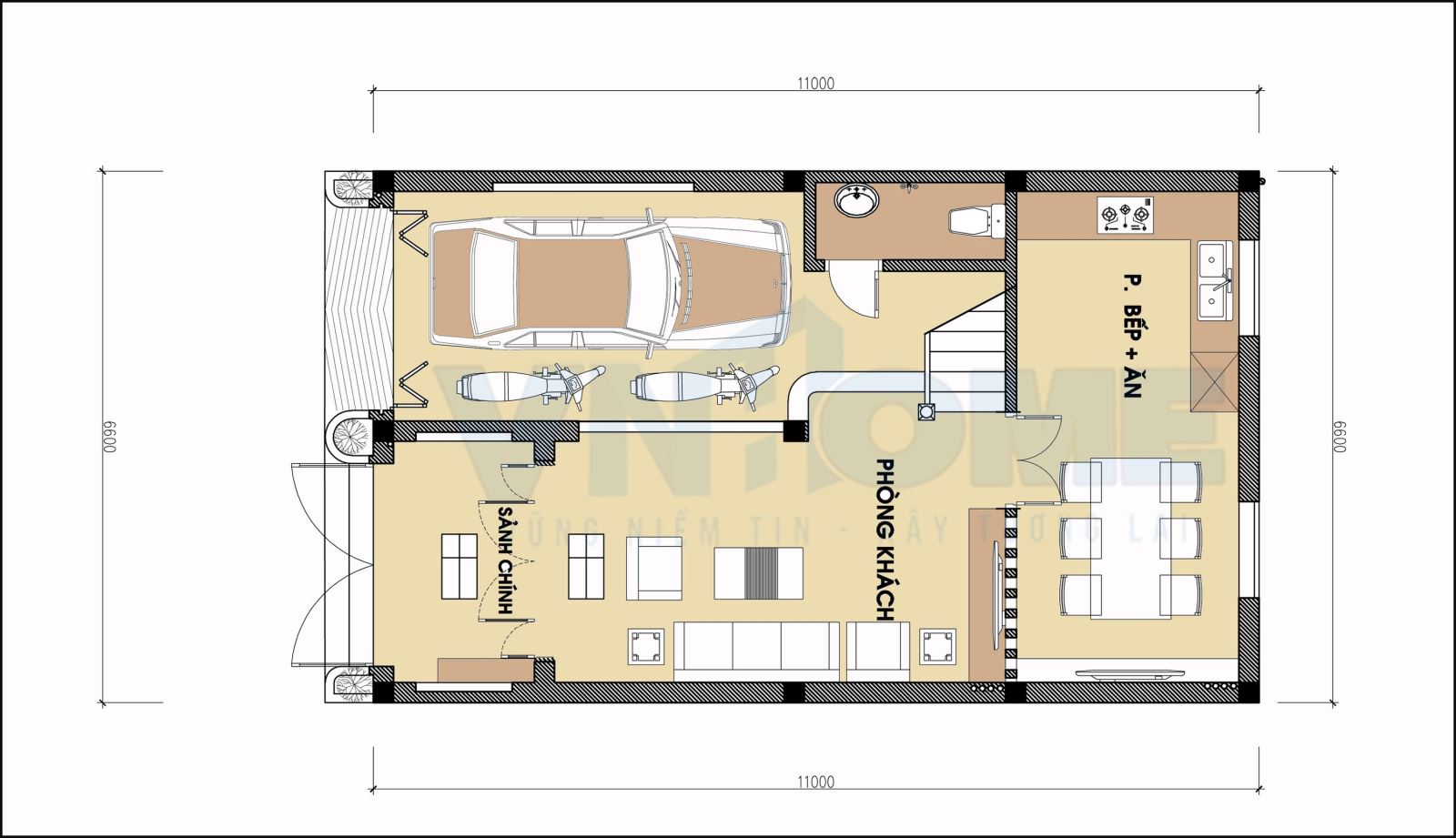Mặt bằng công năng tầng 1 của nhà lô cổ điển tại Hải Phòng.
